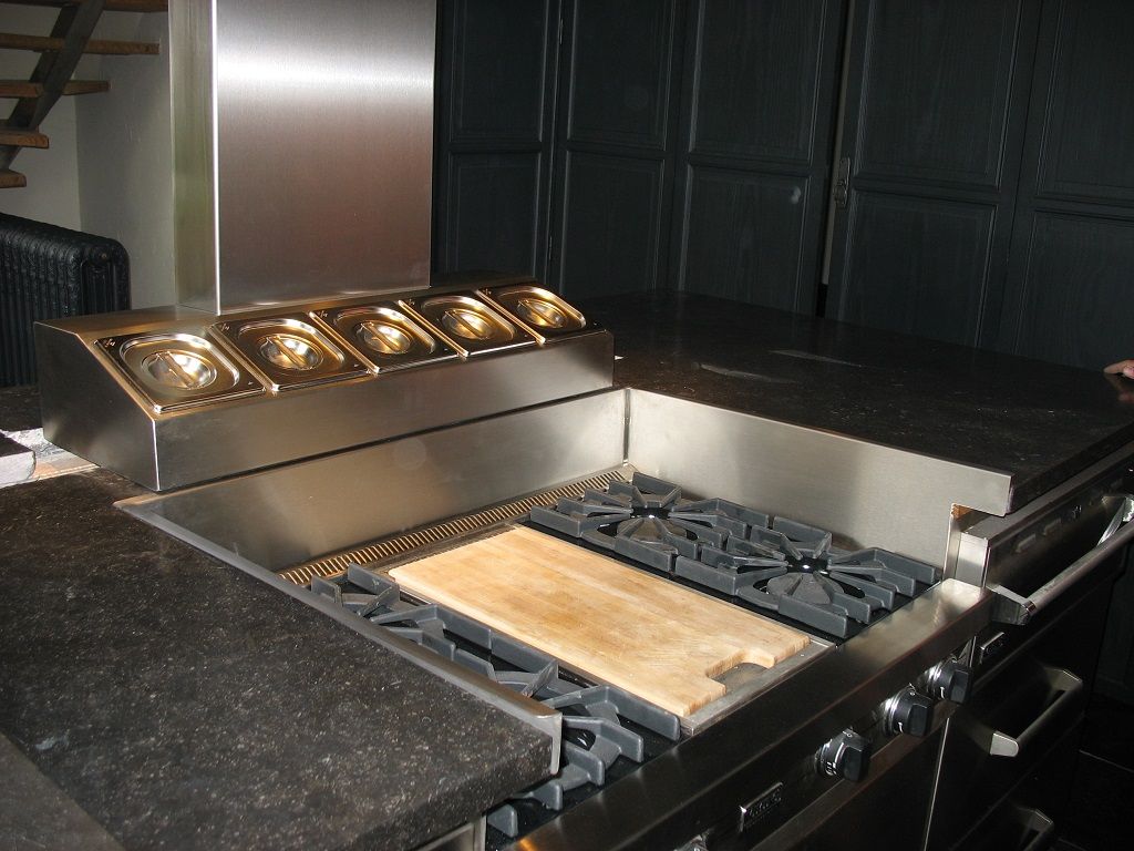 Côté cuisine, nous intervenons dans vos intérieurs avec la réalisation de plans de cuisine, crédences, hottes aspirantes en inox brossé digne d'une cuisine de chef !